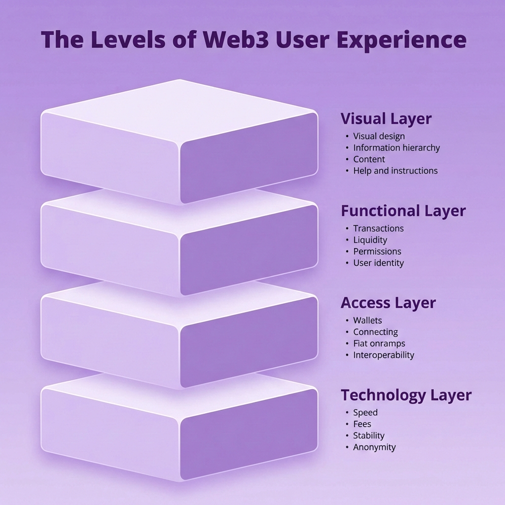 Diagram showing the different layers of web3 UX - source: Medium The multiple levels of web3 UX